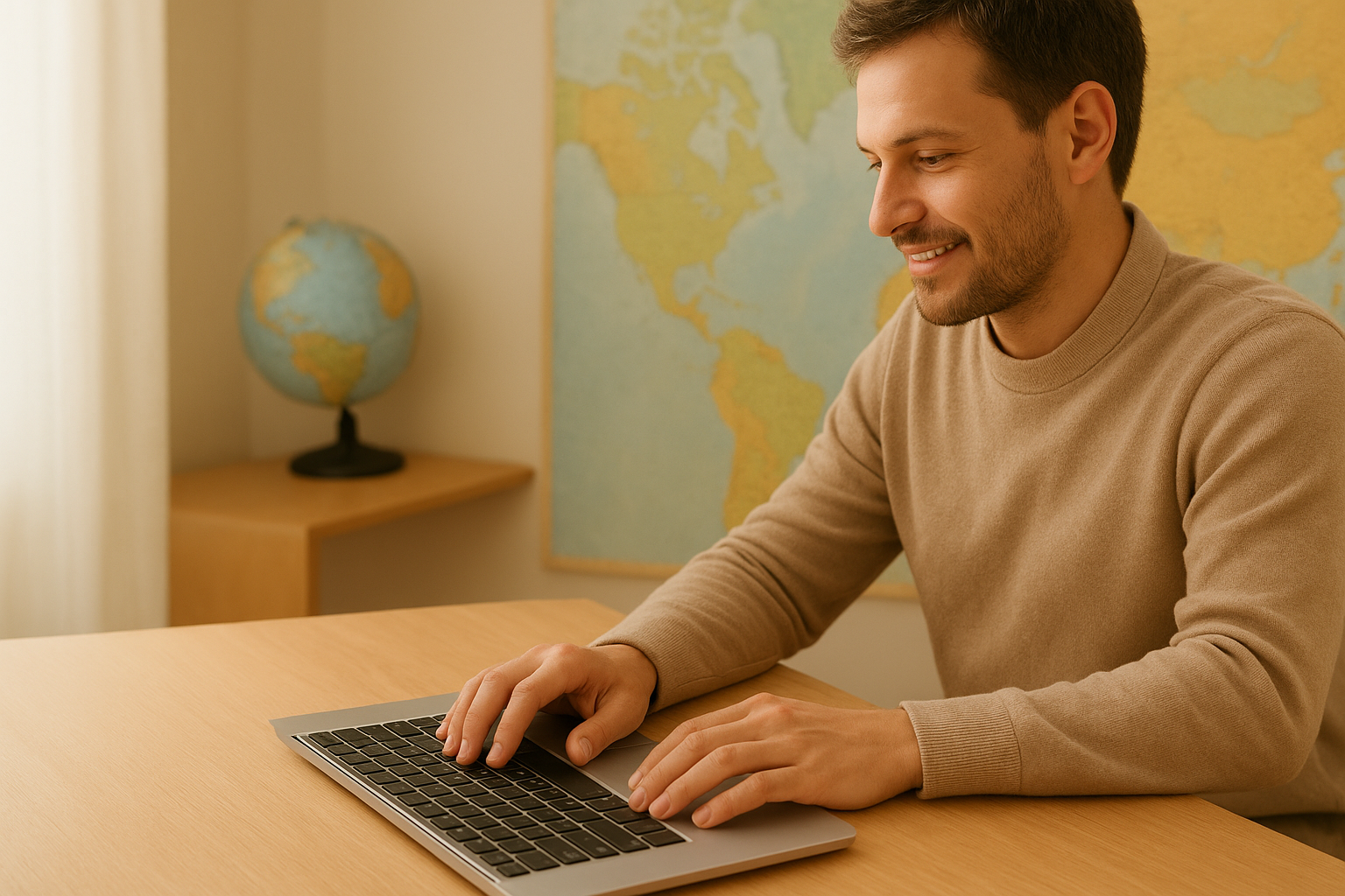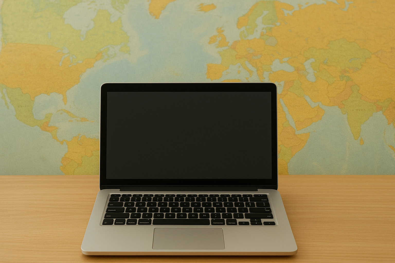 提案画像: 世界地図を背景にノートPCとスマートフォンが置かれたデスク。海外の人々とオンラインでつながる雰囲気を表現。