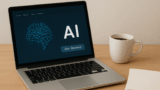 提案画像: ノートPC画面にExcelシートが表示され、横でコーヒーカップとメモ帳が置かれている作業風景