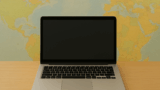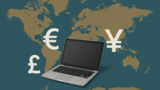 提案画像: 世界地図の上にノートPCを置き、周囲にドル・ユーロ・円などの通貨記号が浮かんでいるデジタルイラスト