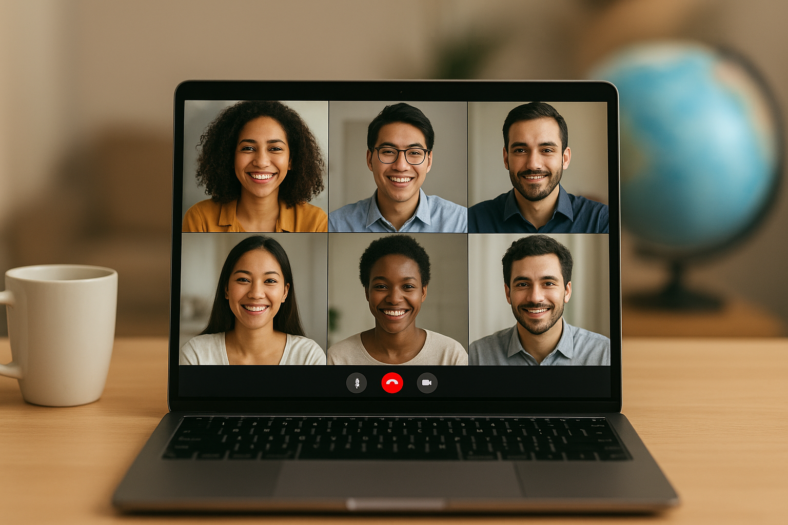 提案画像: ノートパソコンで作業をしながら、コーヒーを片手にリラックスしている人物の写真。