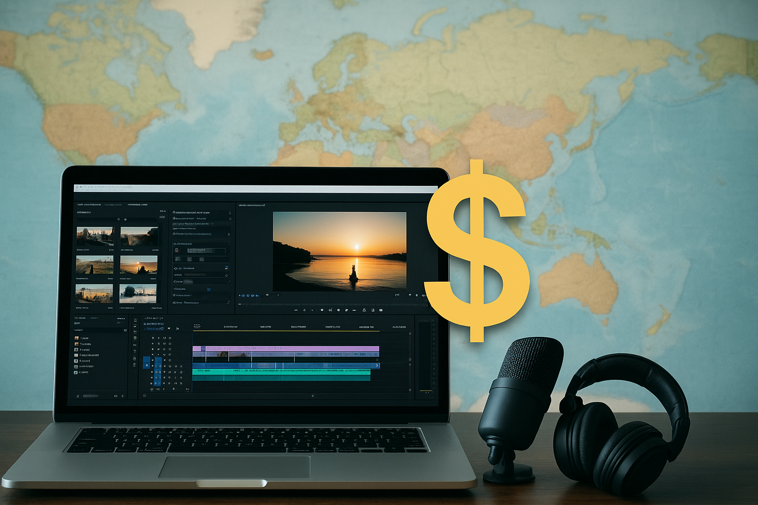 提案画像: 世界地図を背景に、パソコンでプログラミングコードを書いている画面とドル通貨が重なる構図